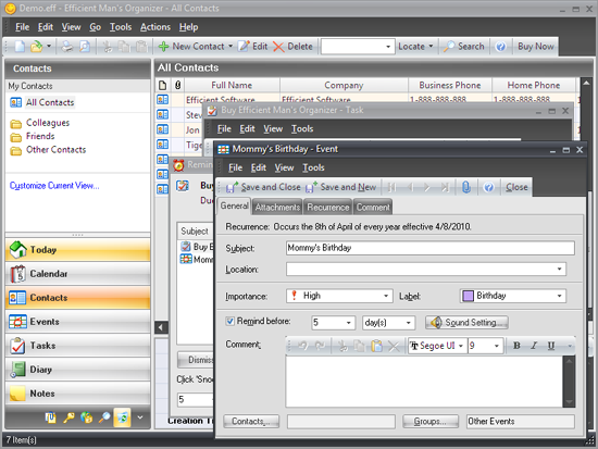 Efficient Man's Organizer 1.05 Build 16 là một gói phần mềm quản lý thông tin cá nhân được thiết kế đặc biệt. Nhiều tính năng tuyệt vời như quản lý thời gian, quản lý liên lạc, lên kế hoạch, nhắc nhở, nhật ký, notepad, bộ quản lý mật khẩu,… được tích hợp trong một gói phần mềm. Đây là một phần mềm portable. Phiên bản portable có thể được chứa trên USB và chạy trực tiếp từ đó. Các tiêu chuẩn khác như việc bảo vệ mật khẩu và khả năng tự động backup có thể bảo đảm cho dữ liệu của bạn được an toàn. Với công cụ tìm kiếm one-click giống như Google, bạn có thể nhanh chóng tìm ra những gì mình muốn từ bên trong khối thông tin cá nhân khổng lồ của mình. Bộ soạn thảo văn bản giống như Microsoft Word được tích hợp để giúp bạn ghi chép nhật ký, các ghi chú, bình luận bất cứ lúc nào. Bên cạnh đó, các phiên bản miễn phí cũng được phát hành cùng thời điểm để đáp ứng các nhu cầu của các bạn bè khác. Ngày của phái nam, hãy bắt đầu bằng cách mở Efficient Man's Organizer.