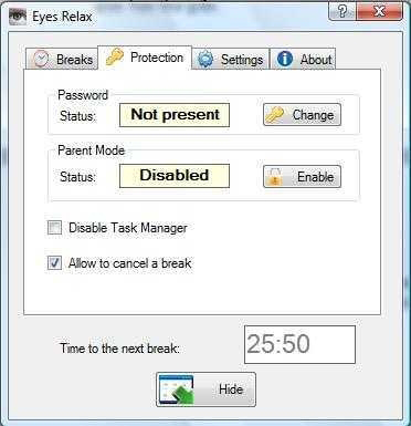 Nhấn vào nút Change tại mục Password để khởi tạo mật khẩu bảo vệ thiết lập của chương trình. Đánh dấu vào mục Disable Task Manager (để tránh trường hợp ai đó truy cập Task Manager để tắt Eyes Relax). Sau đó, nhấn vào nút Enable tại mục Parent Mode để mật khẩu có tác dụng. Sau khi tính năng bảo vệ được kích hoạt, mọi sự thay đổi về thiết lập của phần mềm đều bị vô hiệu hóa.